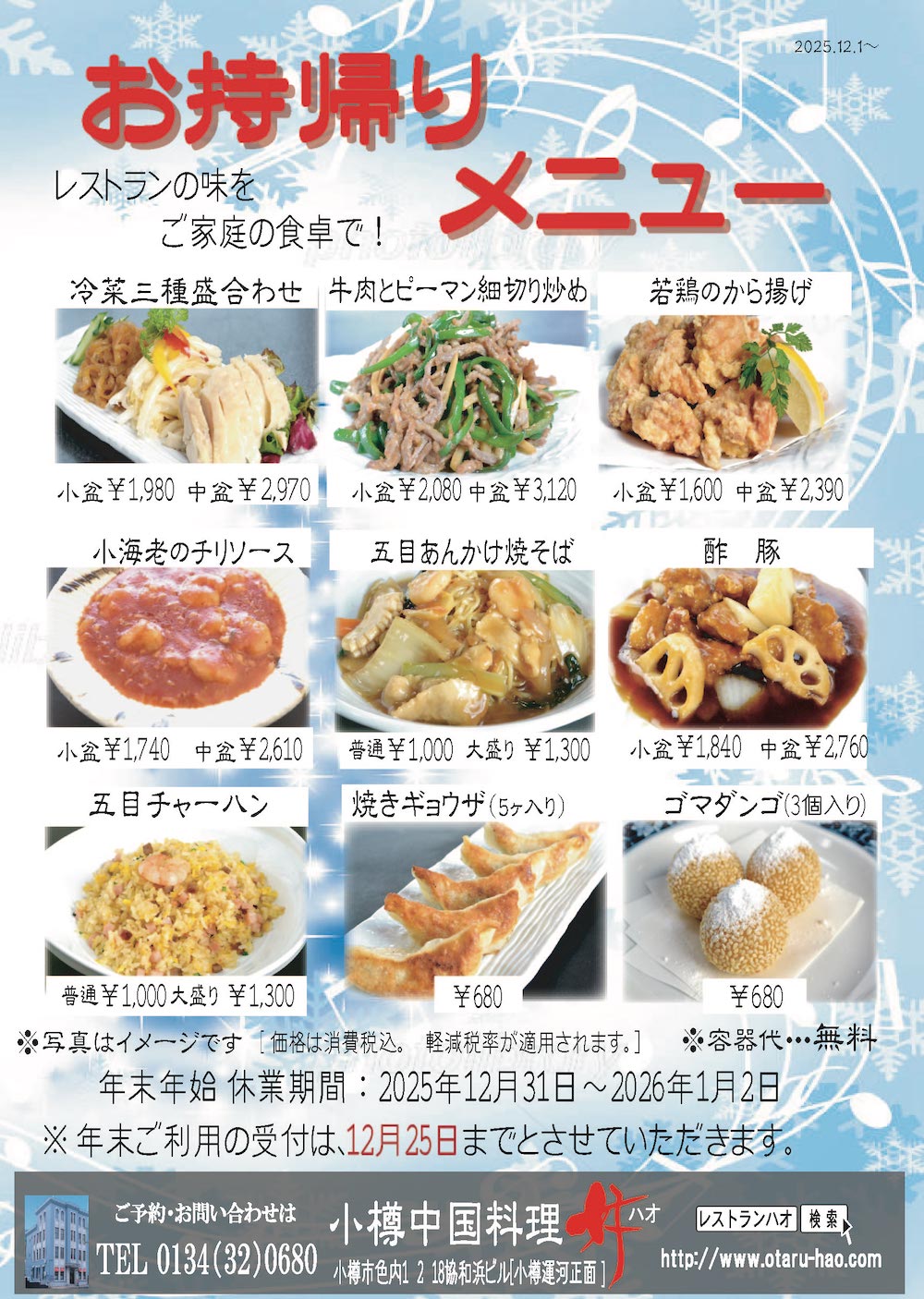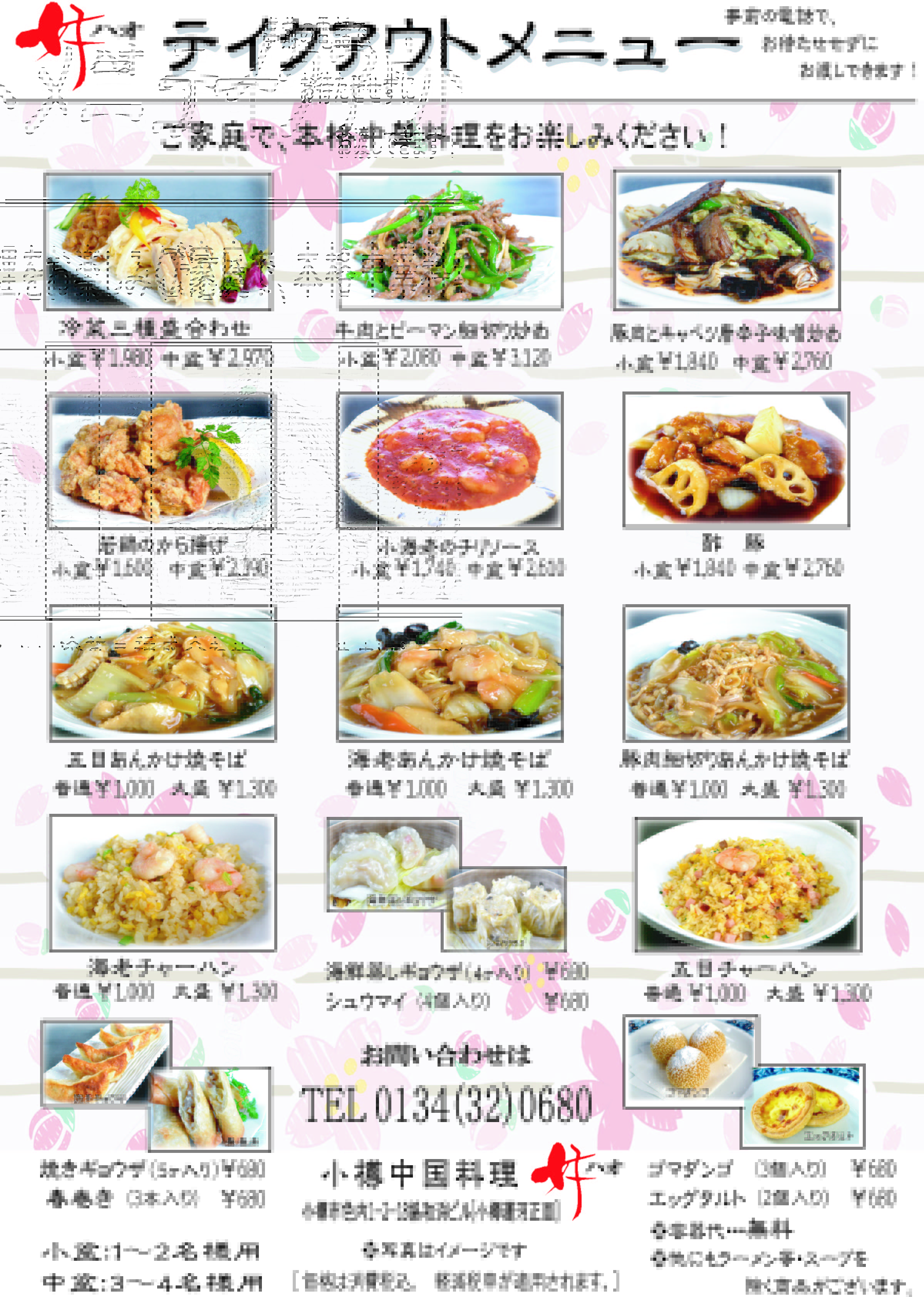 ・ラーメンやスープを除くお料理がお持ち帰り対象になります。お気軽にご相談ください。ご注文やお問い合わせはお電話(0134-32-0680)にて承ります。